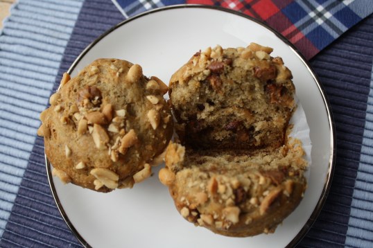Peanut butter and banana is a classic combination, so I thought I’d try it in the form of a muffin. This creation is inspired by Grandma Harper’s much loved Banana Chocolate Chip Muffin recipe, a well-worn recipe card in our house. I had a bag of PC mini peanut butter cups, so I used those instead of chocolate chips, added peanut butter into the batter and topped the muffins with chopped peanuts. What can I say? I love peanuts and peanut butter. The result is a perfectly delicious muffin, fluffy and tender– I only wish I’d thought of it sooner.
