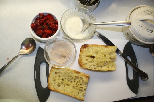 Slice and toast your ciabatta buns, butter, sprinkle with cinnamon sugar and slice on the diagonal. Top with strawberry mixture, add a dollop of yogurt. Enjoy!