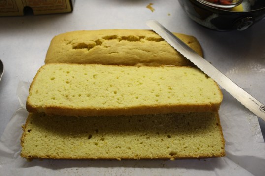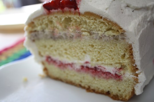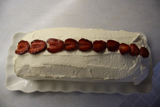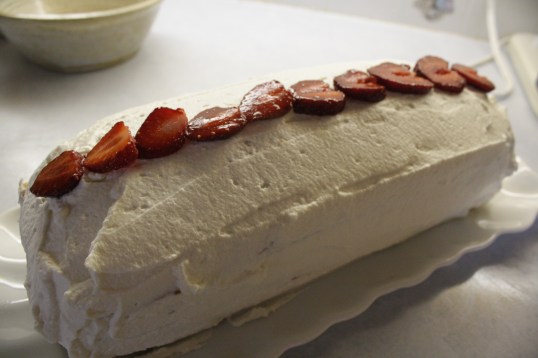 I came across this recipe from a Swedish friend of the family, Margitta. She is well-known for her culinary skills and my daughter, Emily, spent a week in Stockholm with Margitta in May, so I felt inspired to make this cake for my birthday. It is deliciously different from our North American perception of birthday cake, easy to put together, and classy in it’s presentation. It uses an odd sized pan — 12×4 inch loaf pan –I picked one up at a kitchen store for $10, but if your feeling brave, try it in your regular 9×5 loaf pan and let me know the result. It is 3 layers of strawberry/banana/whip cream in a vanilla cake, and it’s absolutely delicious. It will serve 8-10 people, so try it at your next birthday celebration – the recipient will feel extra special and everyone I served it to -and I’ve made it twice so far — loved it.