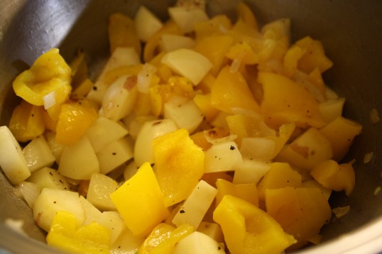 - In a large saucepan over medium heat, cook the onion in oil until softened. Add the broth, peppers and potatoes. Bring to a boil, reduce the heat and simmer until the vegetables are tender, about 15 minutes.