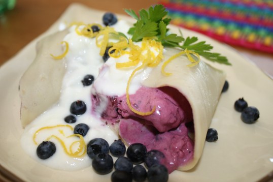blueberry ice cream filled crepe with yogurt and berries with lemon zest