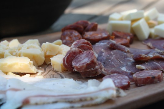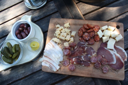 Since ‘chacuterie’ (prepared and preserved meats) seems to be the trend these days, this platter of cured meats and old cheeses was just the answer for an afternoon with company on the patio. Try to find a good local source for some of these delicacies. I love to have some on hand in the fridge — great if company shows up unexpectedly…with a cold beer or nice glass of wine or a spritzer, it’s hospitable and tastes great too. Put out some mustard, pickles and olives and Bob’s yer uncle. 😉