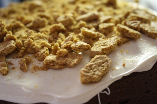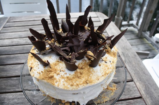 Here’s an idea for a birthday cake I made today. It’s a chocolate layer cake that I  made from scratch, but use your favourite chocolate cake recipe, out of a box is fine.  I melted about 15 marshmallows with 3 tbsp of butter, and added that to a pre-packaged tub of white icing. I refrigerated that until it firmed up a bit. Frosted the cake, added some crumbled graham crackers in the center and sprinkled on top. Made chocolate shards and stuck them in. Quite dramatic looking, wouldn’t you say? Quite delicious too. Serve with ice cream. Fun!