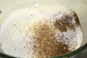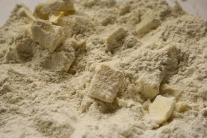 In a large bowl, mix together flour, spices, baking powder, salt and sugar.  Drop in butter cubes and toss to coat. Using your fingertips or a pastry blender, cut and rub the butter into the flour until the butter is pea-sized and smaller (various sizes).  I squeeze the butter with my fingertips, and as soon as I feel the greasiness of the butter, I drop it back in the flour, and look for another piece to squeeze. Do that until you can’t really pick up any pieces and that should be fine.