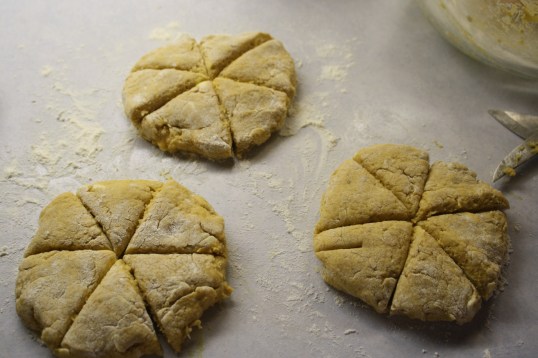 Place dough on a floured counter and split into 3 equal pieces.  Form into discs approximately 1 inch thick. Cut each disc into 6 wedges. Place wedges on baking sheet and bake for about 12 minutes, until bottoms are slightly browned and tops seem just firm. Cool.