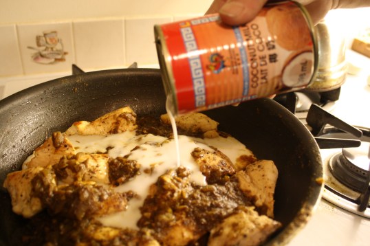 brown chicken in same pan (don't clean it), then add curry paste back into pan