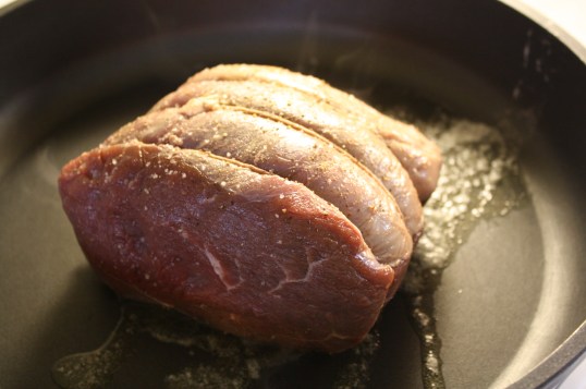 Anyhow, I bought a grass-fed beef sirloin tip roast – it works well for pot roast — or use a blade or other tough chunk of beef. We’ll be cooking it low and slow so all those fibrous strands of meat will break down in the process, all the while providing some great flavour.  I chose ‘grass-fed’ because that is what cows are supposed to eat naturally and I believe that it is way, way more healthy to eat this kind of beef.