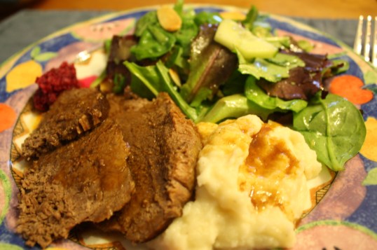 Slow-cooked pot roast, pureed cauliflower, gravy, green salad, beet horseradish