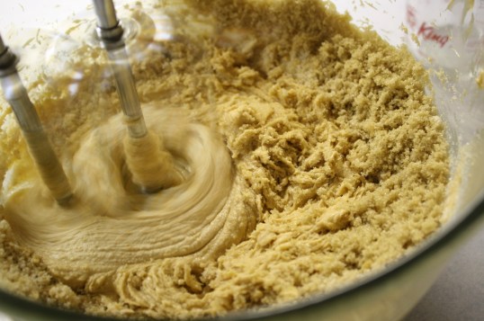 In separate bowl, mix together flour, baking soda, nutmeg and salt. On low speed, gradually add to peanut butter mixture. When just combined, remove mixing things and finish combining all the flour with a spatula.  Cover bowl with plastic wrap and refrigerate for an hour or so, until firm.