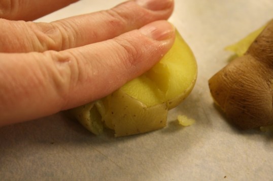 In a large saucepan, place potatoes. Cover with water and a generous teaspoon of salt. Cook until just tender, about 8 minutes. Drain and cool for a few minutes until they are easy to handle.