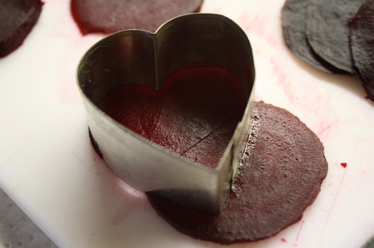 use cookie cutter to cut into heart shapes. (piece together if beet slices are too small)