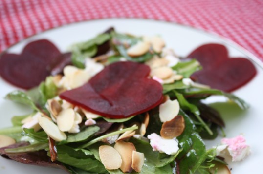 Peel beets, and slice thinly on a mandolin. Using a heart-shaped cookie cutter, make beet hearts. Place on plates. Β Toss greens with vinaigrette, and place in center of plates. Top with feta and nuts. Enjoy!!