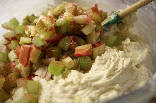 You will be adding the flour in 4 additions, alternating with the buttermilk in 3 additions. So, add approximately one quarter of the flour mixture, mix on low until blended in. Add approximately 1/3 of the buttermilk mixture. Add another quarter of the flour mixture, etc., until they are mixed in, then buttermilk… ending with the flour mixture. Remove mixers from batter and using a spatula, fold in rhubarb. Pour batter into pan. Mix remaining 1/4 cup of sugar with cinnamon and sprinkle over top.