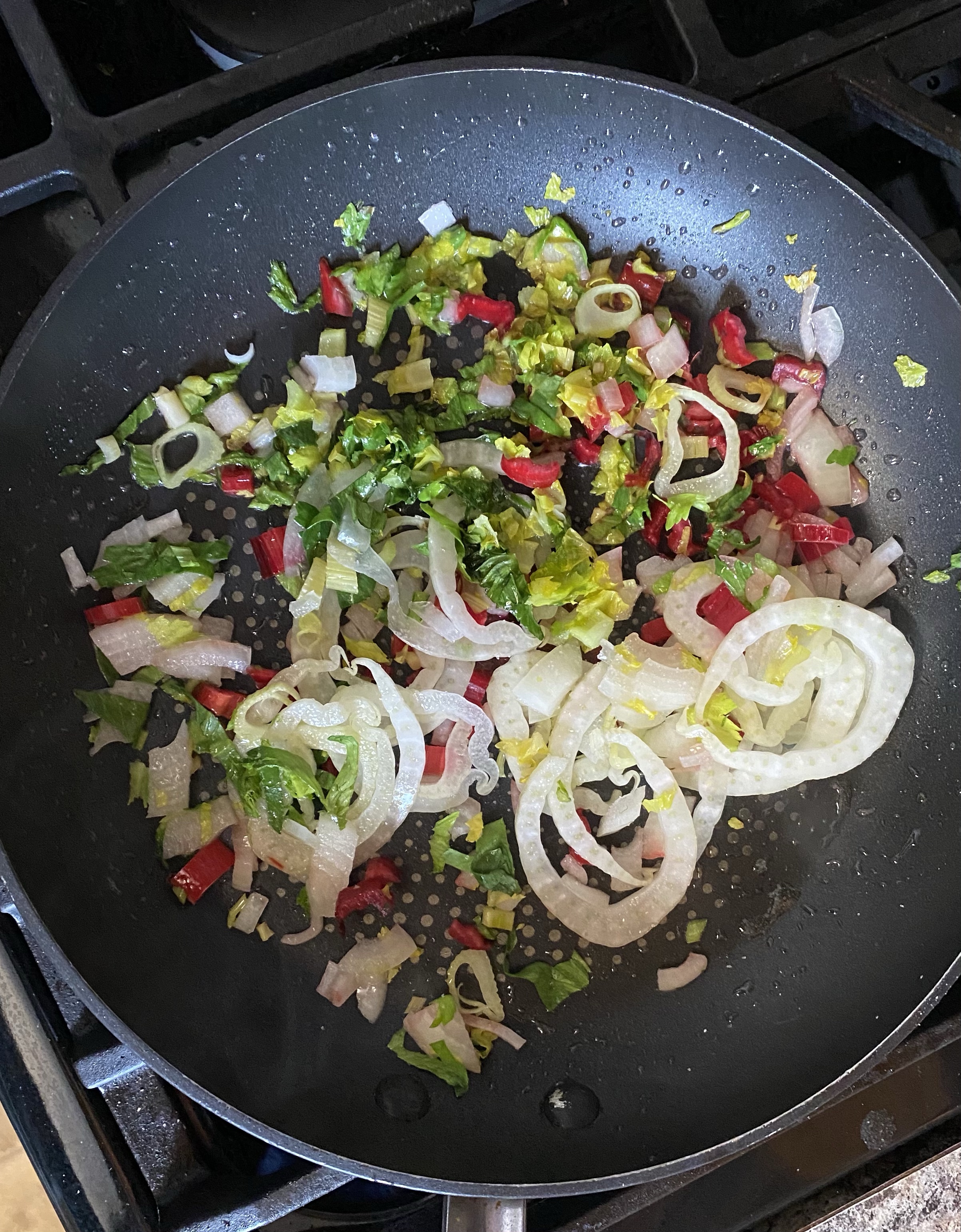 Heat olive oil in medium-sized pan over medium heat. Add onions, diced chard stems, celery and fennel to pan. Add salt and pepper. Saute gently until softened – 5 minutes or so. Remove from heat.