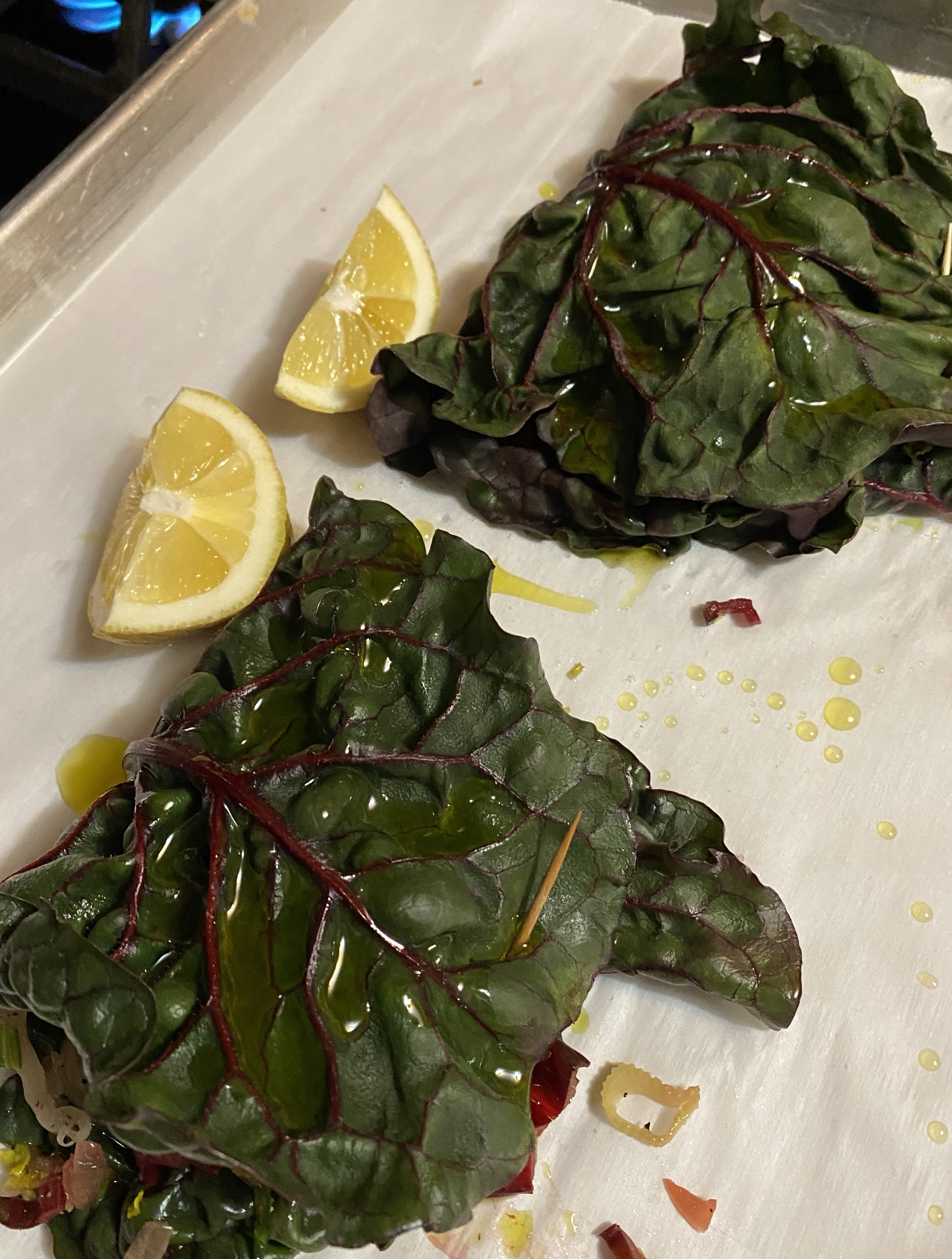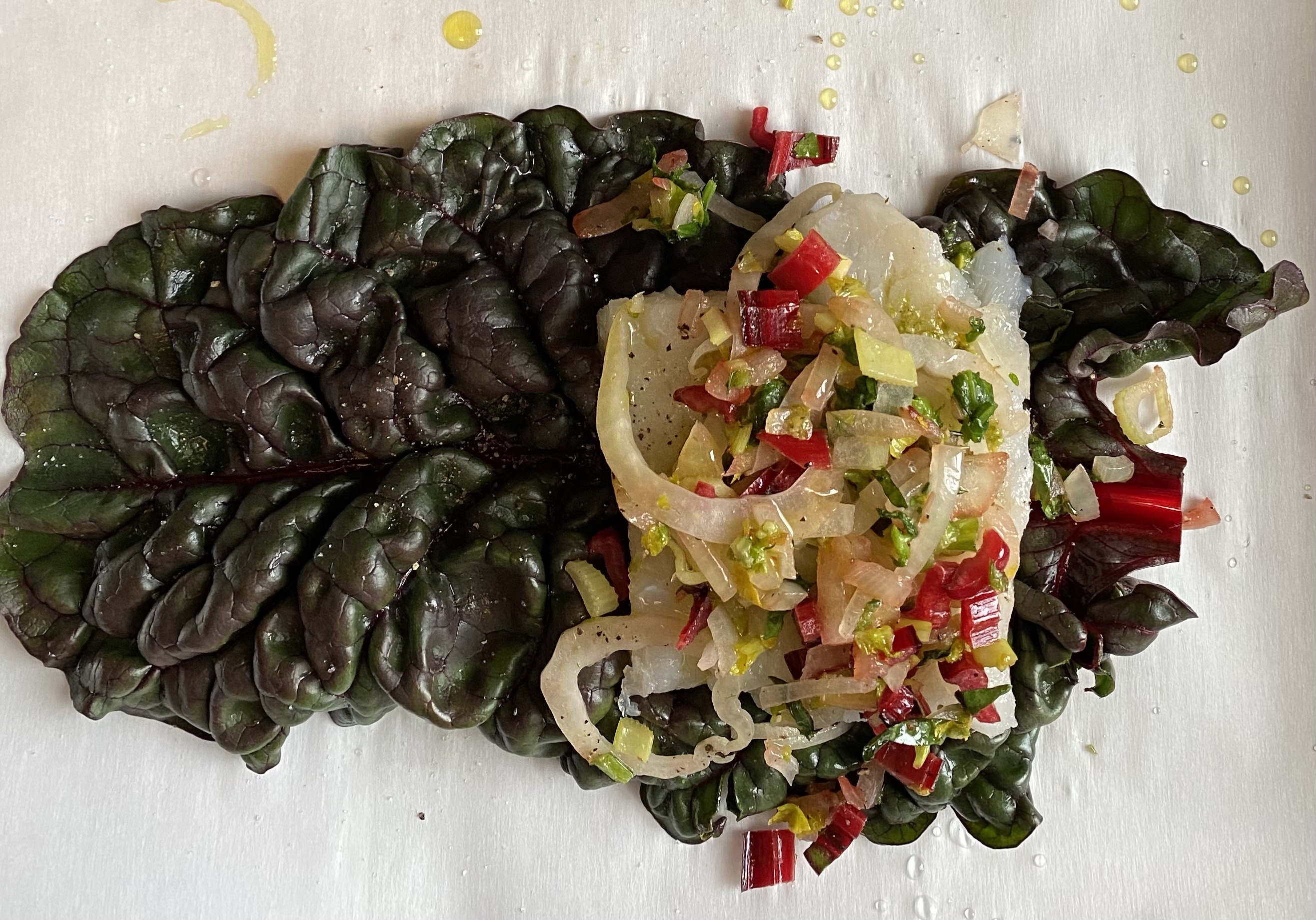 To cook fish in a parchement paper packet, follow the instructions, but place fish on a square of parchment instead of chard leaf. Wrap/fold edges to create a packet. (I used some chopped chard or kale leaf with this alternative, as I love the flavours together).