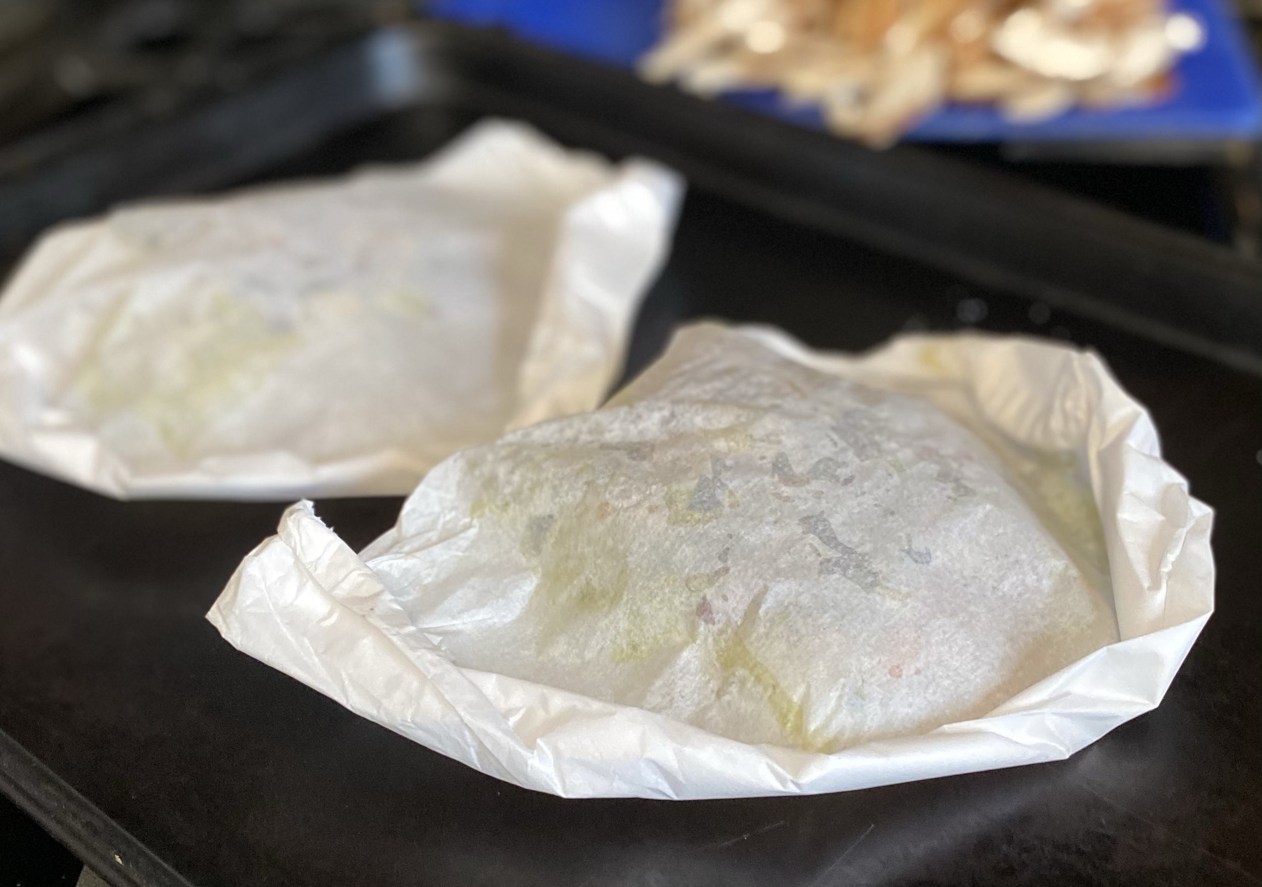 Spread 2 tsp of basil pesto on top of each fish filet. Divide vegetable mixture and spoon on top of filets. Drizzle a little olive oil and lemon juice over the fish. Fold over leaf and adhere with a toothpick. (Can be prepared to this point and refrigerated to bake later).