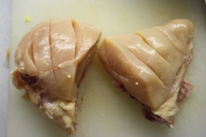 use a cleaver to chop breast in half, then score the meat about 1/2 inch deep